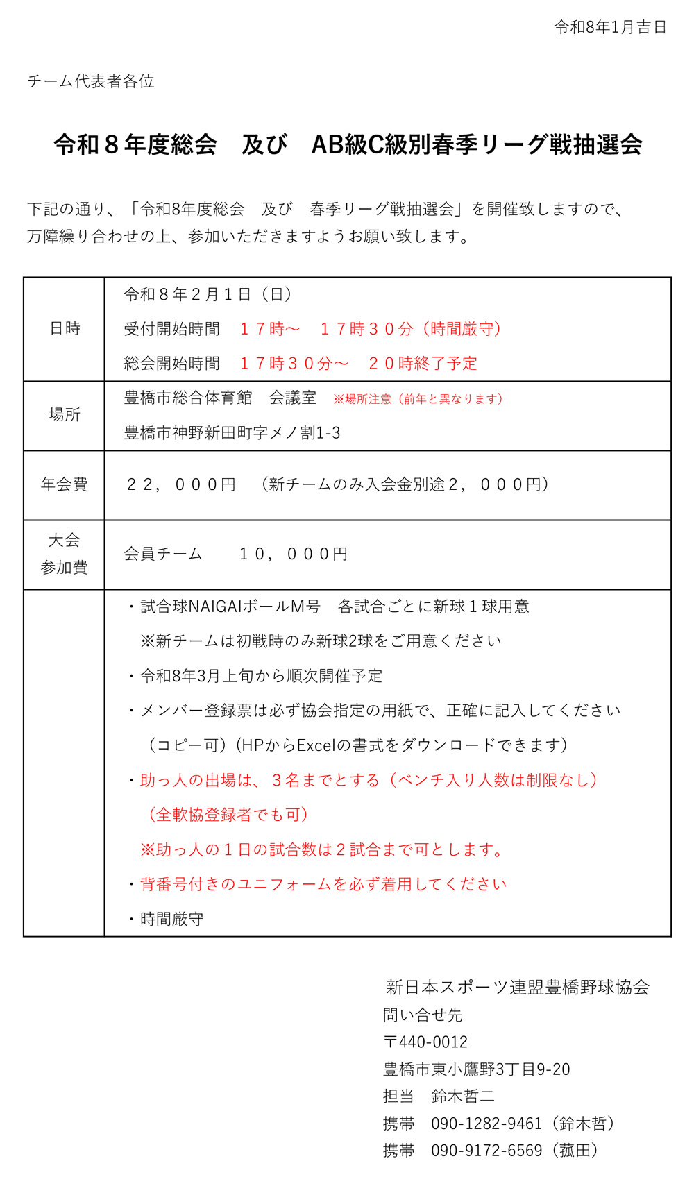 「令和8年度総会 及び 春季リーグ戦抽選会」のご案内です。